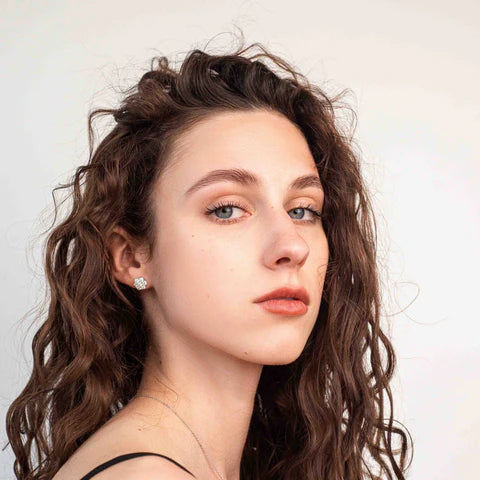 These stud earrings feature round moissanite stones clustered together to evoke the appearance of two fully-bloomed flowers. The elegant floral-shaped prong setting only adds to the timeless charm and captivating beauty of this classic design.